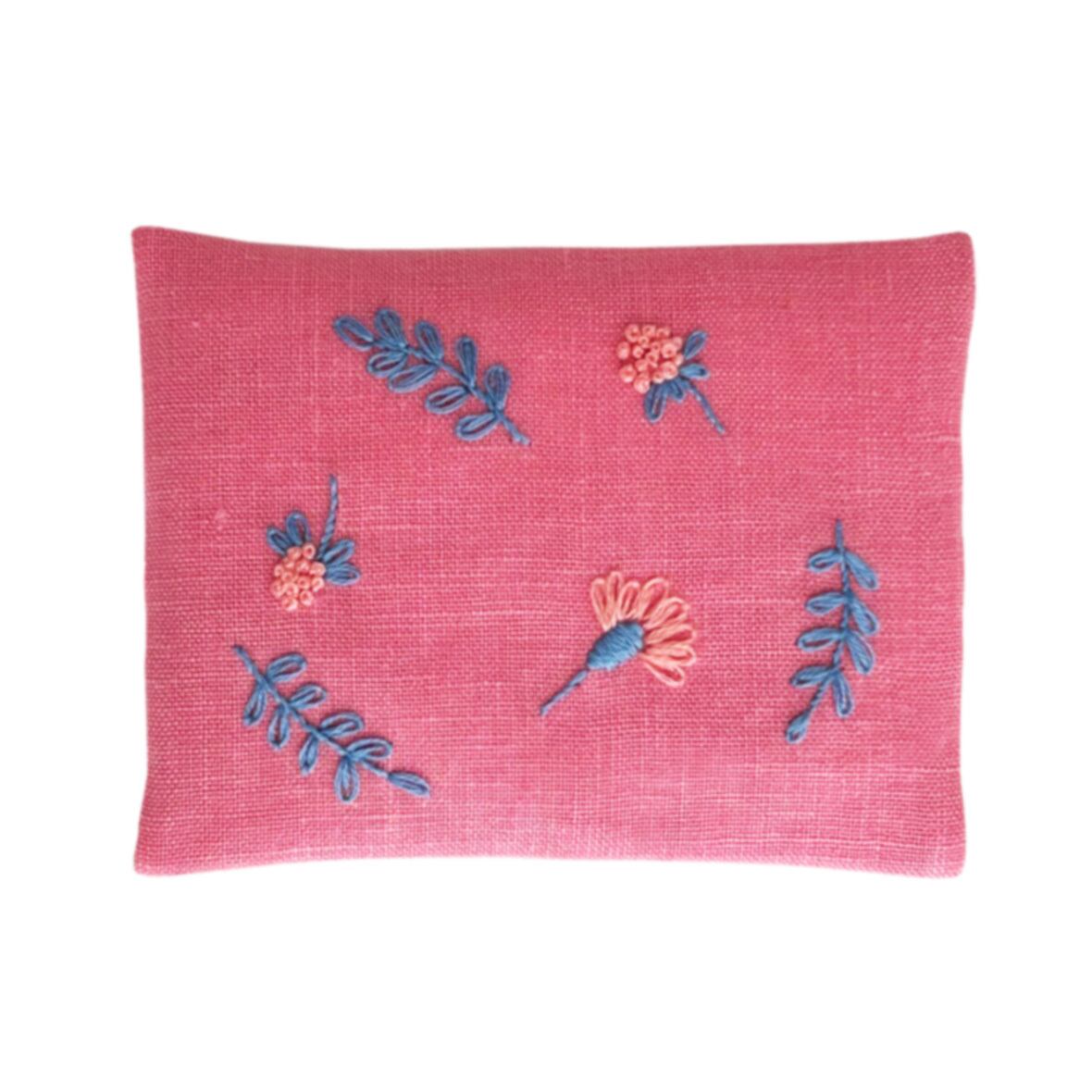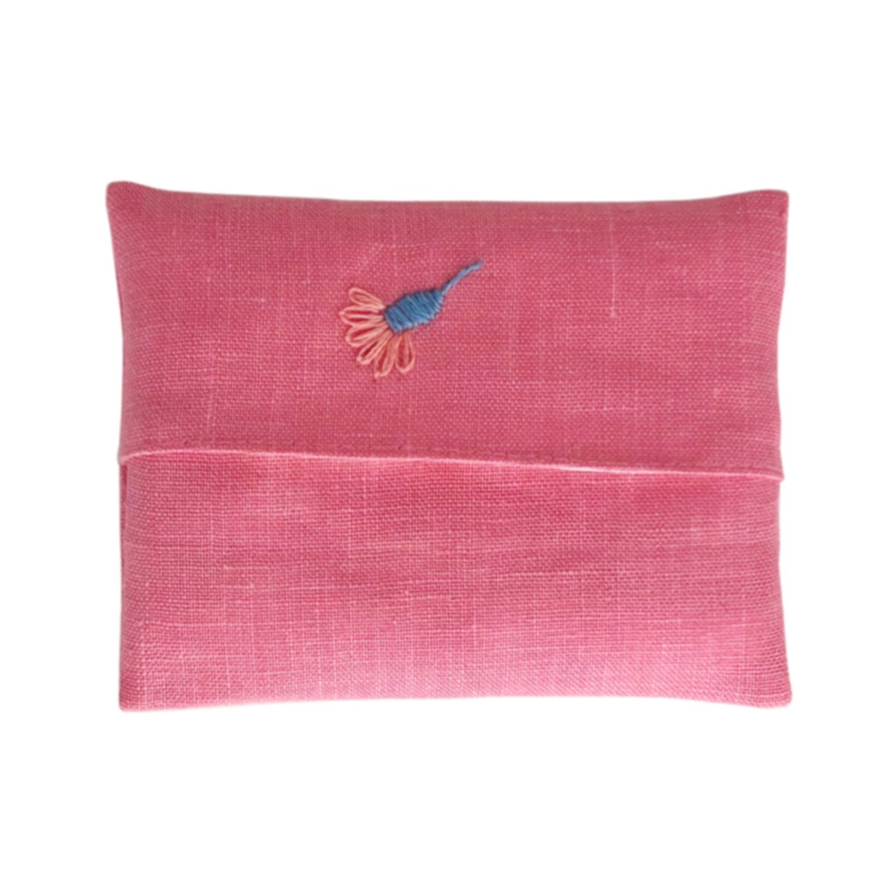 麻布に手刺繍のポケットティッシュのカバー(麻裏地付き)<ピンクに小さな花>