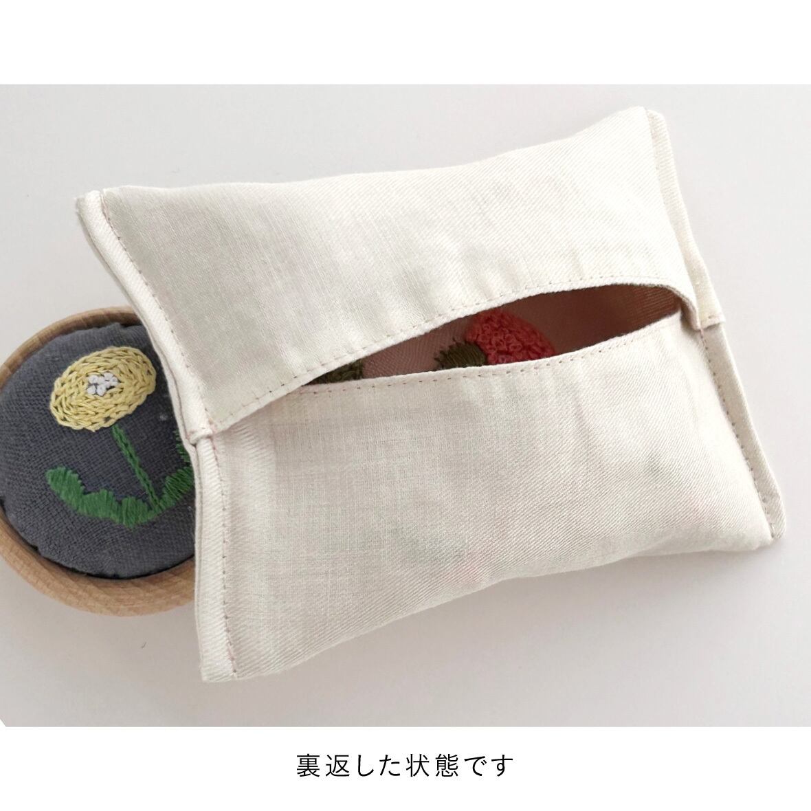 きんちゃくと同じ麻布、同じ花の刺繍でつくりました。裏地も同じ薄手の麻(クリーム色)でつけました。