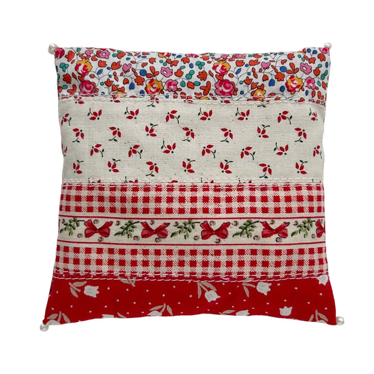 いろんな木綿地をパッチワークしたピンクッションです。4角には真珠のビーズをつけました。
